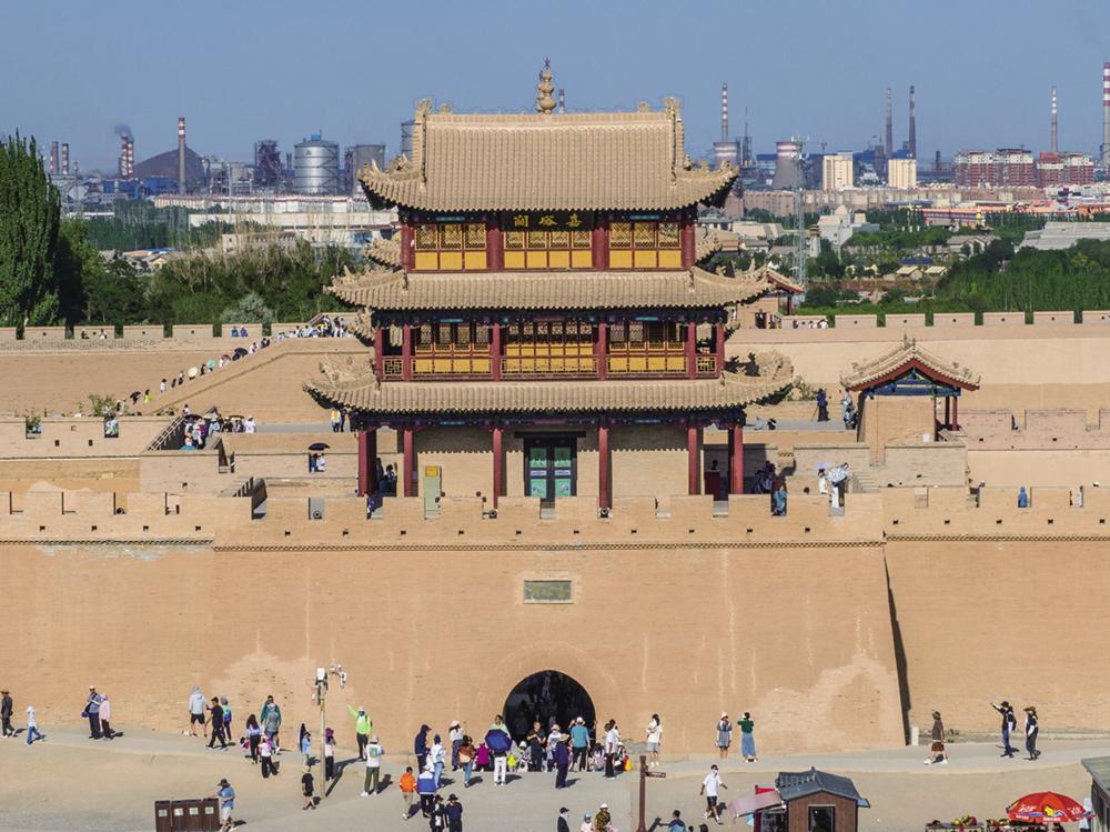 这是8月7日拍摄的嘉峪关关城(无人机照片)。 嘉峪关是明代万里长城的西端起点,被称为“天下第一雄关”。进入暑期以来,位于甘肃省嘉峪关市的嘉峪关关城旅游景区游客数量持续上升,单日最多接待游客数量突破3万人次。新华社记者 张可任 摄