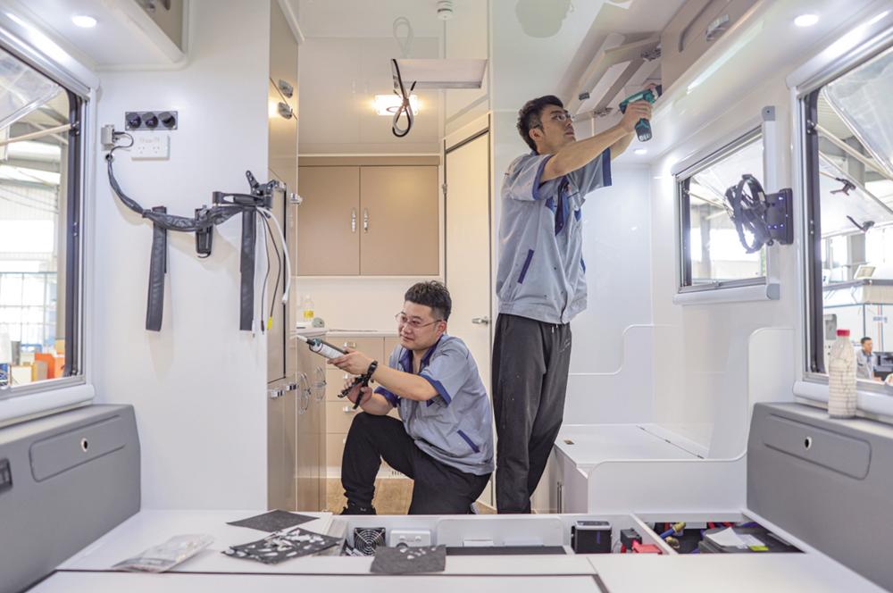 8月24日,山东省荣成市一家房车制造企业的工人在安装房车组件。