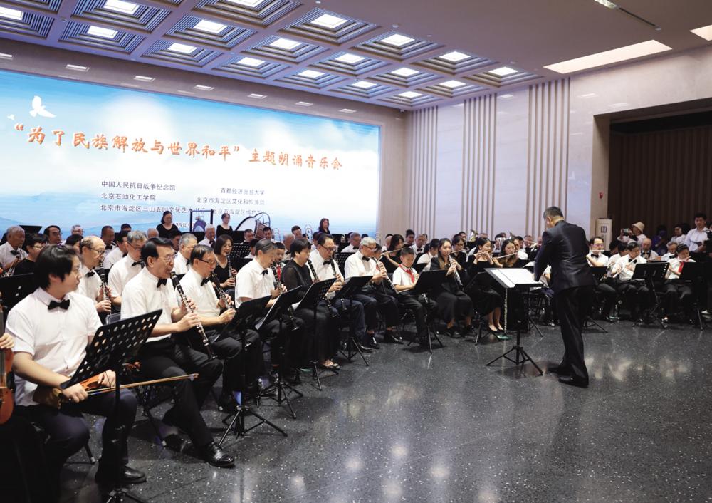 9月18日在中国人民抗日战争纪念馆拍摄的“为了民族解放与世界和平”主题朗诵音乐会。 9月18日,中国人民抗日战争纪念馆举办“为了民族解放与世界和平”主题朗诵音乐会,以朗诵、合唱、管弦乐演奏等形式,带领观众重温抗战历史、缅怀英雄先烈、弘扬抗战精神、传递和平信念。新华社记者 张晨霖 摄