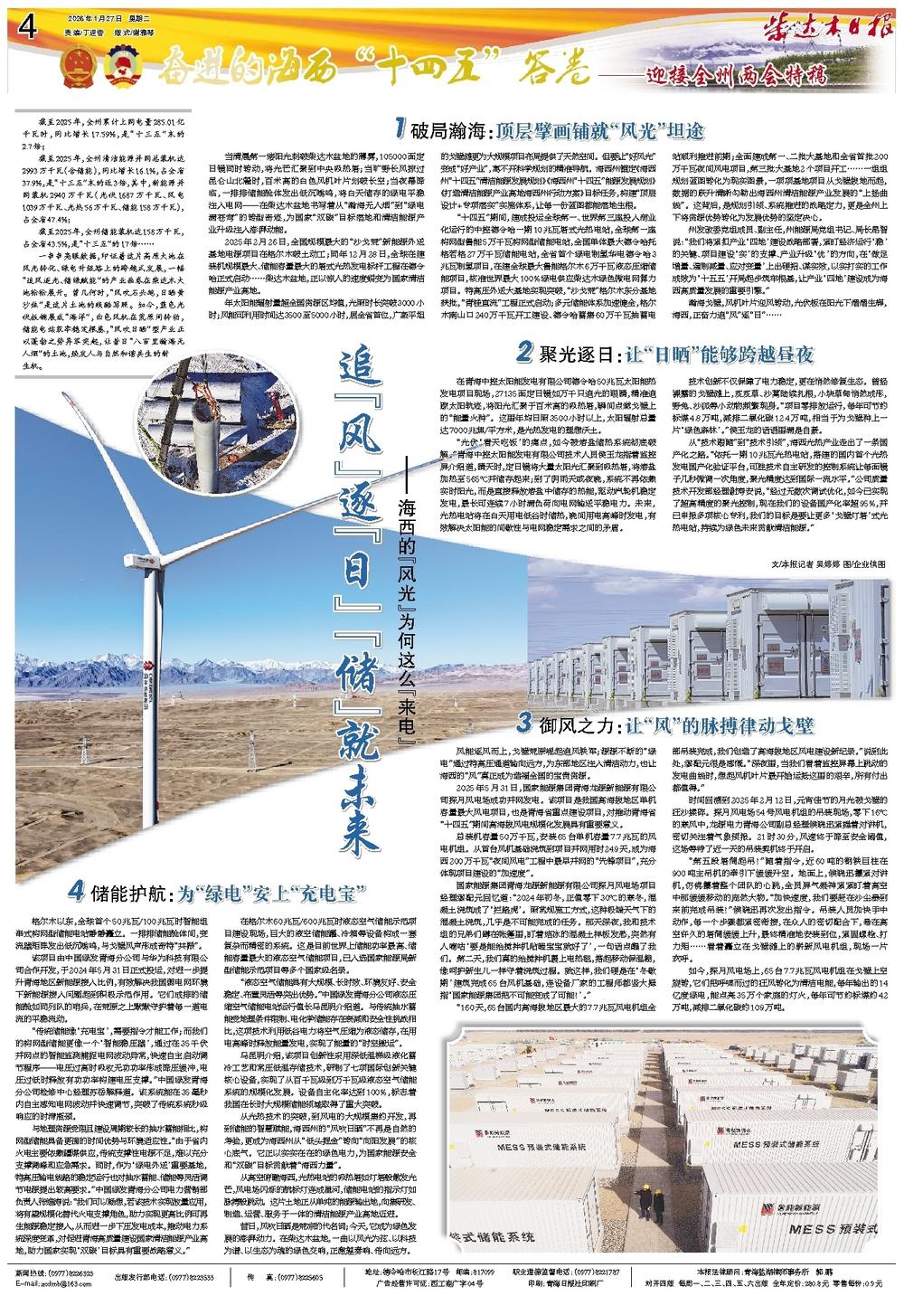 “十四五”期间,建成投运全球第一、世界第三座投入商业化运行的中控德令哈一期10兆瓦塔式光热电站,全球第一座构网型鲁能5万千瓦构网型储能电站,全国单体最大德令哈托格若格27万千瓦储能电站,全省首个绿电制氢华电德令哈3兆瓦制氢项目,在建全球最大鲁能格尔木6万千瓦液态压缩储能项目,核准世界最大100%绿电供应柴达木绿色微电网算力项目。特高压外送大基地实现突破,“沙戈荒”格尔木东分基地获批,“青桂直流”工程正式启动;多元储能体系加速健全,格尔木南山口240万千瓦开工建设、德令哈蓄集60万千瓦抽蓄电站顺利推进前期;全面建成第一、二批大基地和全省首批200万千瓦夜间风电项目,第三批大基地2个项目开工……一组组规划蓝图转化为现实图景,一项项基地项目从戈壁拔地而起,数据的跃升清晰勾勒出海西州清洁能源产业发展的“上扬曲线”。这背后,是规划引领、系统推进的战略定力,更是全州上下将资源优势转化为发展优势的坚定决心。