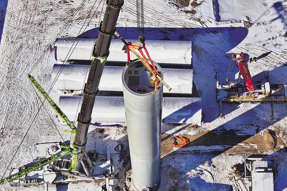 “第五段塔筒起吊!”随着指令,近60吨的钢铁巨柱在900吨主吊机的牵引下缓缓升空。地面上,候晓迅攥紧对讲机,仿佛攥着整个团队的心跳,全员屏气凝神紧紧盯着高空中那缓缓移动的庞然大物。“加快速度,我们要赶在沙尘暴到来前完成吊装!”候晓迅再次发出指令。吊装人员加快手中动作,每一个步骤都紧密衔接,在众人的密切配合下,悬在高空许久的塔筒缓缓上升,最终精准地安装到位,紧固螺栓、打力矩……看着矗立在戈壁滩上的崭新风电机组,现场一片欢呼。