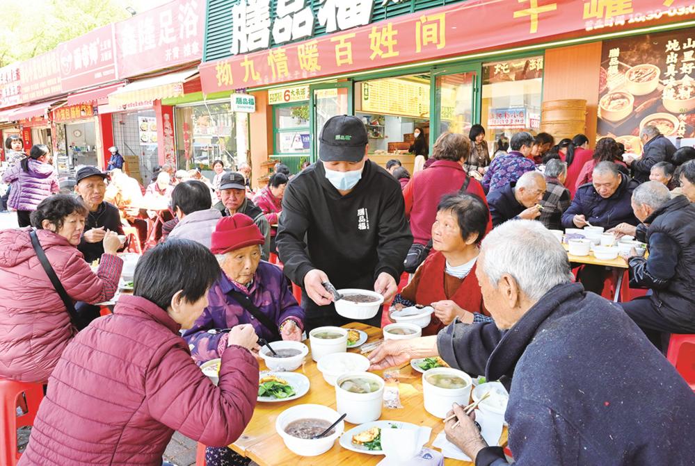 3月17日,在福州市仓山区后巷路,一位餐饮店主(中)为老人送上“拗九粥”。 3月17日是农历正月二十九,是福州的传统节日“拗九节”,也被称为“孝顺节”。福州多地开展为老人送粥、送祝福活动,弘扬孝道文化。 新华社记者 林善传 摄