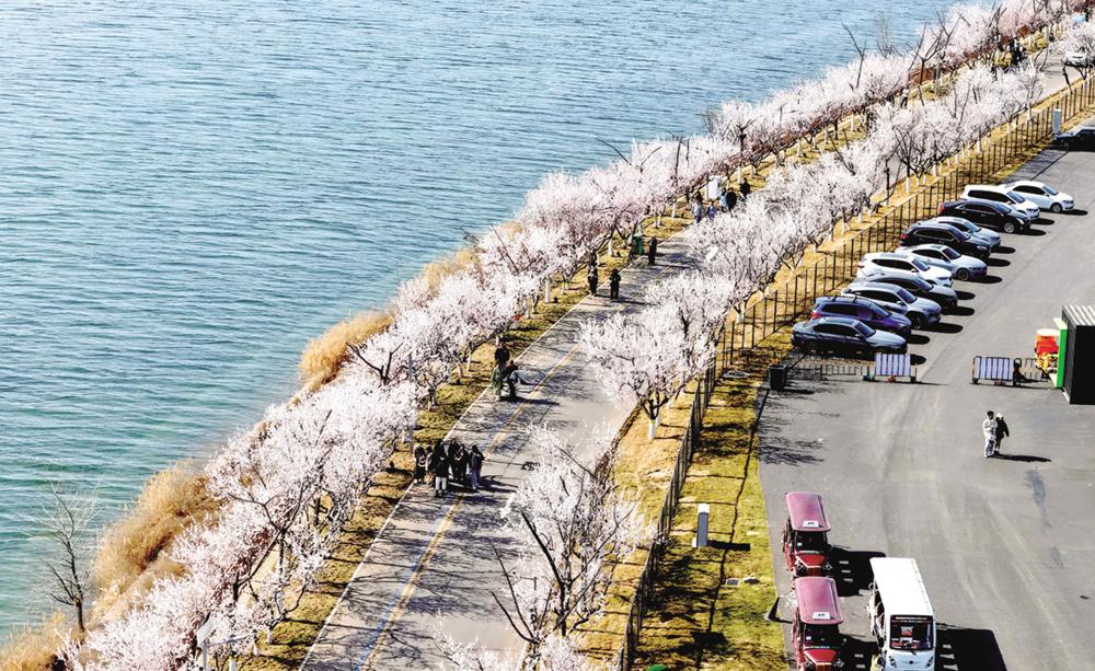 3月16日,游客在河北省石家庄市滹沱河畔赏花游玩(无人机照片)。 春风和煦,花红柳绿,人们踏青赏花,享受美好春光。 新华社发(陈其保 摄)