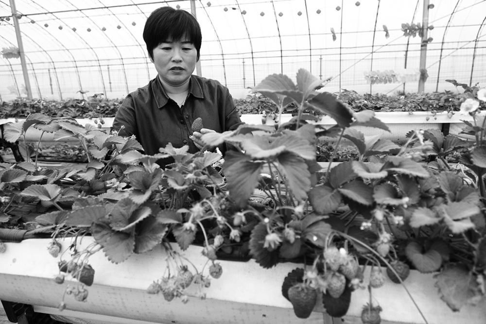 3月16日,在山东省菏泽鲁西新区马岭岗镇,农民正高级农艺师顿俊玲在草莓种植大棚内查看草莓成长情况。