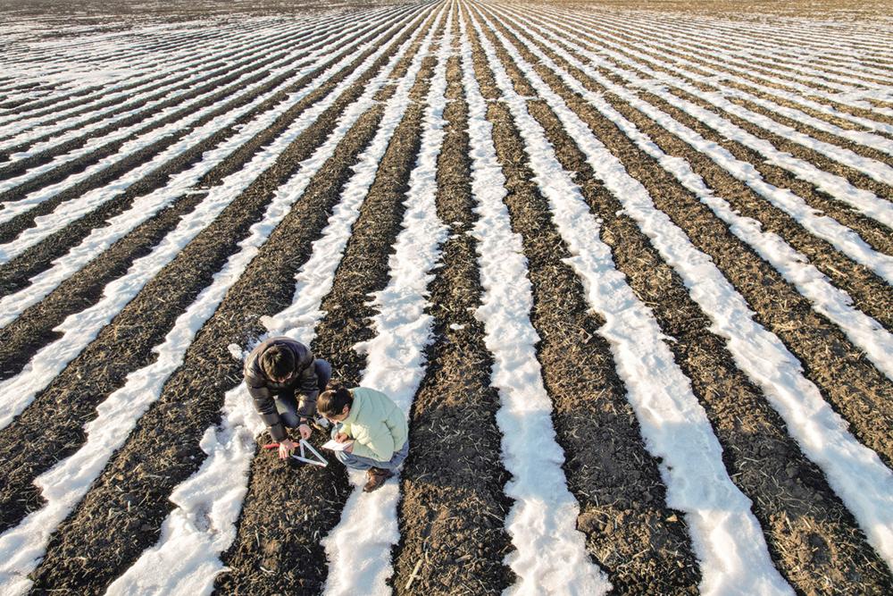 3月14日,在北大荒集团建设农场有限公司农业科技园区试验田,孙凡红(右)与同事一起查看融雪期土壤融化深度情况(无人机照片)。 新华社记者 王松 摄