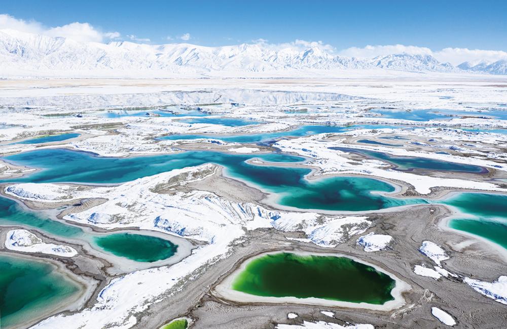 翡翠湖是由早期大柴旦化工厂在历年的硼矿开采过程中形成的采坑,由于水中矿物质的含量不同,而形成由多种颜色湖水,构成的大小不一、形态迥异的小型水池群,由于湖水颜色宛若翡翠,周边有盐白景色衬托,旅友们称之为“中国的马尔代夫”,翡翠湖实际上是大柴旦湖的湖滨地带的老化工原料采区,核心区面积约十余平方公里,有三十余个面积不等的采池构成。景区面积约为6平方公里,分为6个观光景点,每个观光景点都有自己独特的颜色和地容地貌,利用旅游观光小火车将游客送至各个景点。