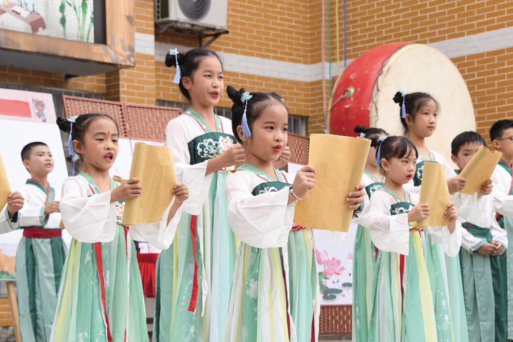 8月30日,广西河池市罗城仫佬族自治县第二小学学生在“开笔礼”上诵读古诗。