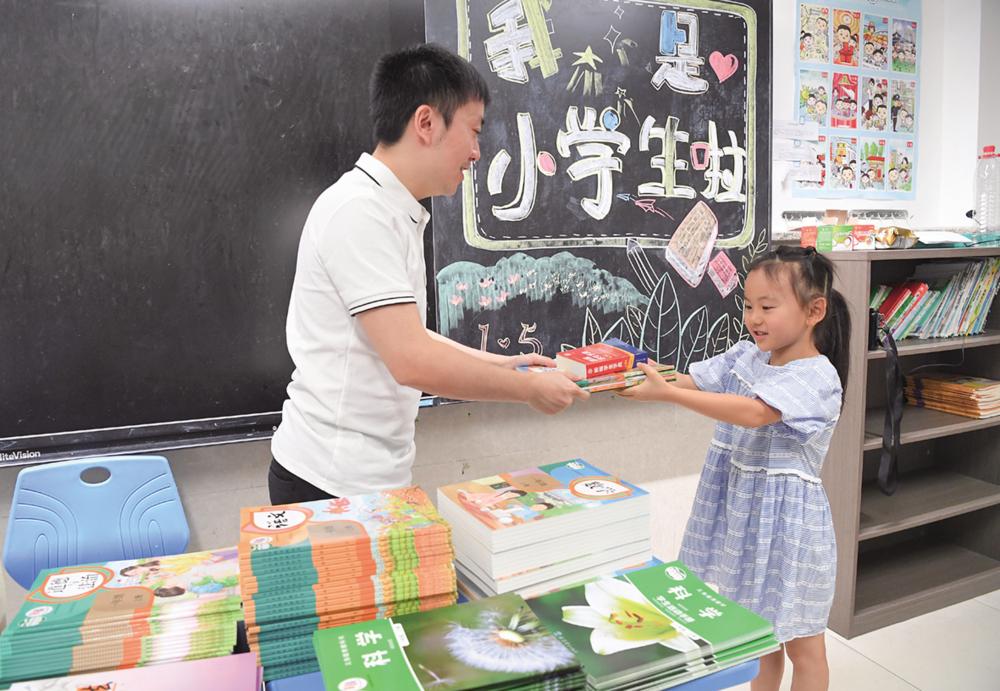8月30日,重庆市南岸区天台岗雅居乐小学一年级学生在教室领取新书。