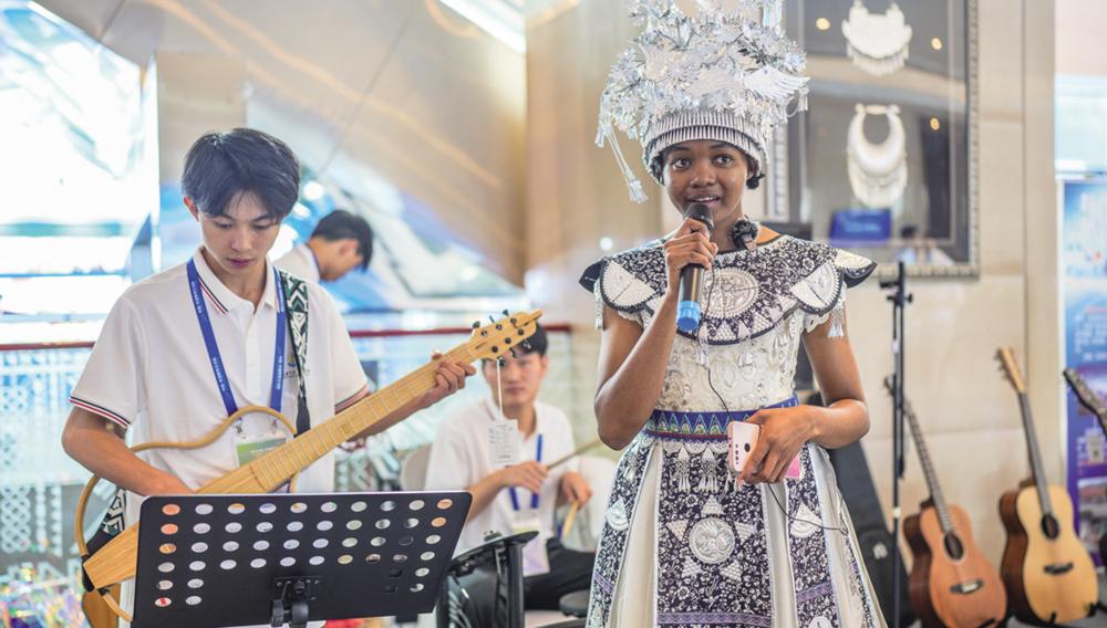 8月29日,国际留学生在交流周活动上演唱歌曲《山水贵客》。
