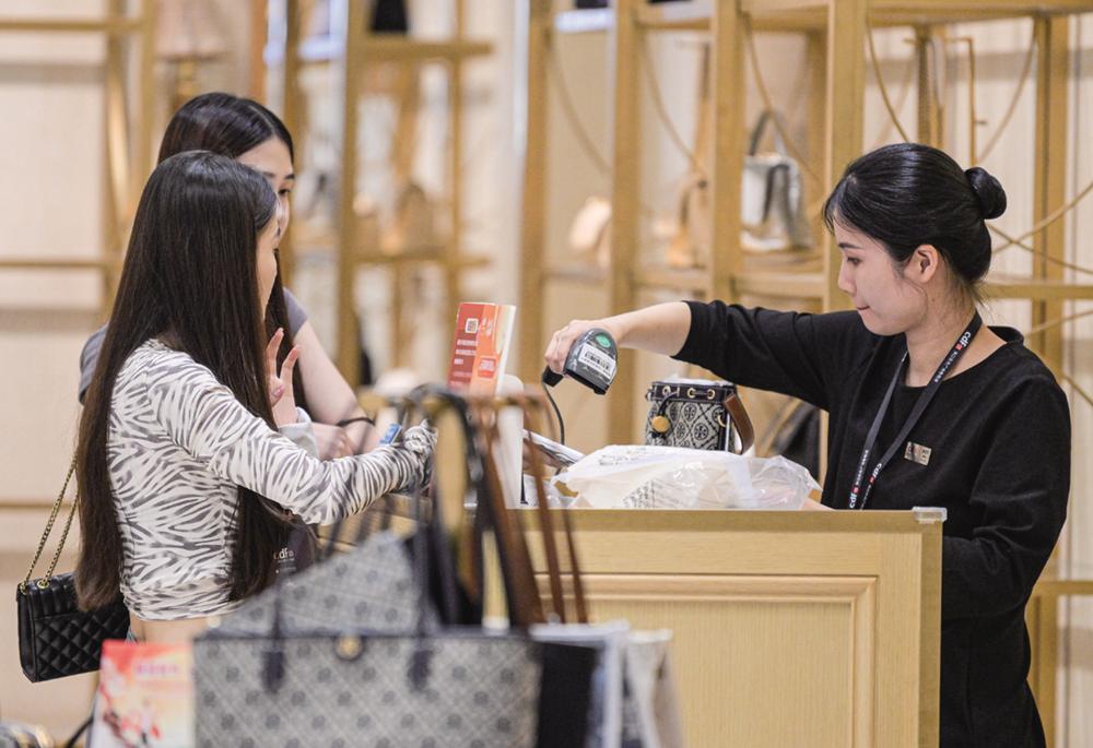 消费者在中免集团海口日月广场免税店购物(9月29日摄)。 2023年中秋国庆“双节”期间(9月29日至10月6日),海口海关共监管离岛免税销售金额13.3亿元,免税购物人数17万人次。新华社记者 蒲晓旭 摄