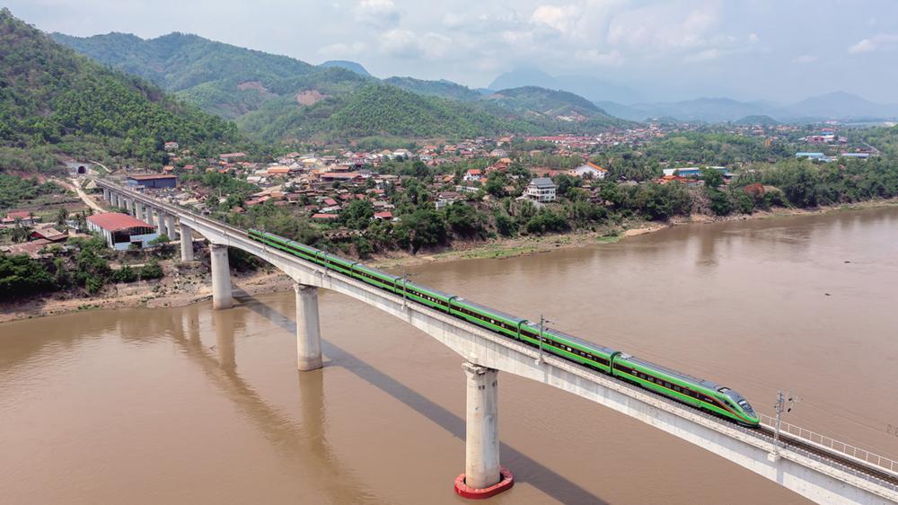 2023年5月28日,中老铁路客运列车通过老挝琅勃拉邦湄公河特大桥(无人机照片)。中老铁路北起中国昆明,南抵老挝万象,全长1035公里,是“一带一路”共商合作、共建项目、共享红利的生动例证。截至10月3日,中老铁路开通运营满22个月,累计运输货物2680多万吨,其中进出境货运量550万吨,货物品类增加至2700多种。新华社发(陈畅 摄)