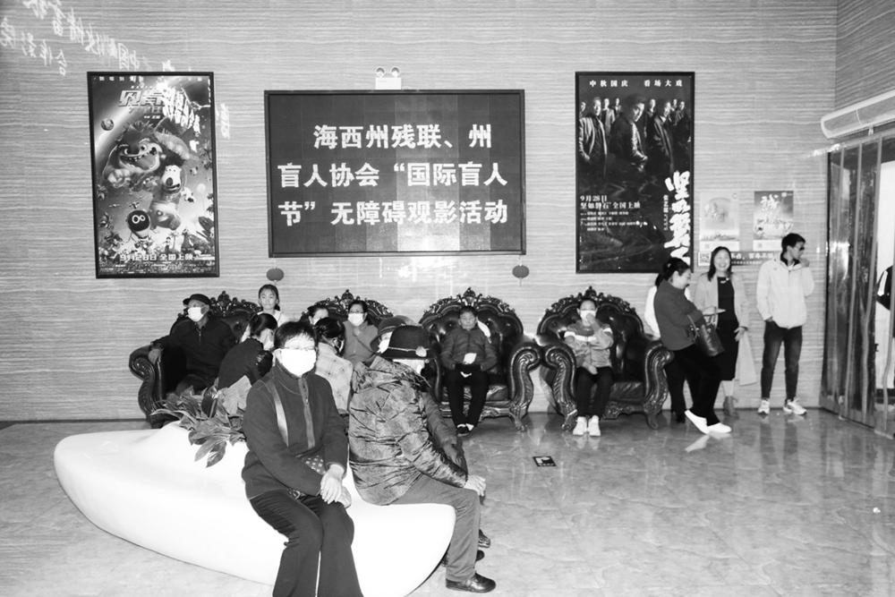 为帮助视障人士实现无障碍“观影”,感受电影艺术的魅力, 10月13日,州残联、州盲人协会举办的“国际盲人节”无障碍观影活动在德令哈市电影院举行。伴随着电影的音乐响起,解说员开始了“同声传译”,解说员在电影台词间隙插入对影片画面的讲解,详细描述画面内容以及故事内涵,将故事娓娓道来,让盲人朋友在聆听中感受跌宕起伏的情节,在声音交互中用心“看”懂电影。 本报记者 查宝音 摄影报道