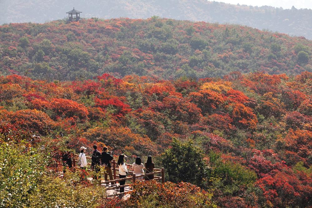 ◀10月14日,游客在河南省焦作市博爱县青天河靳家岭景区欣赏红叶。 金秋时节,各地色彩斑斓,秋景怡人。 新华社发(程全 摄)