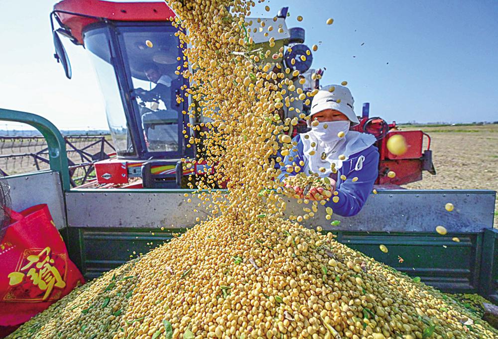 10月14日,在河南省洛阳市孟津区会盟镇黄河岸边的下古村,农民收获大豆。 金秋时节,各地农民抢抓农时收获农作物,田间地头洋溢着丰收的喜悦。 新华社发(李卫超 摄)