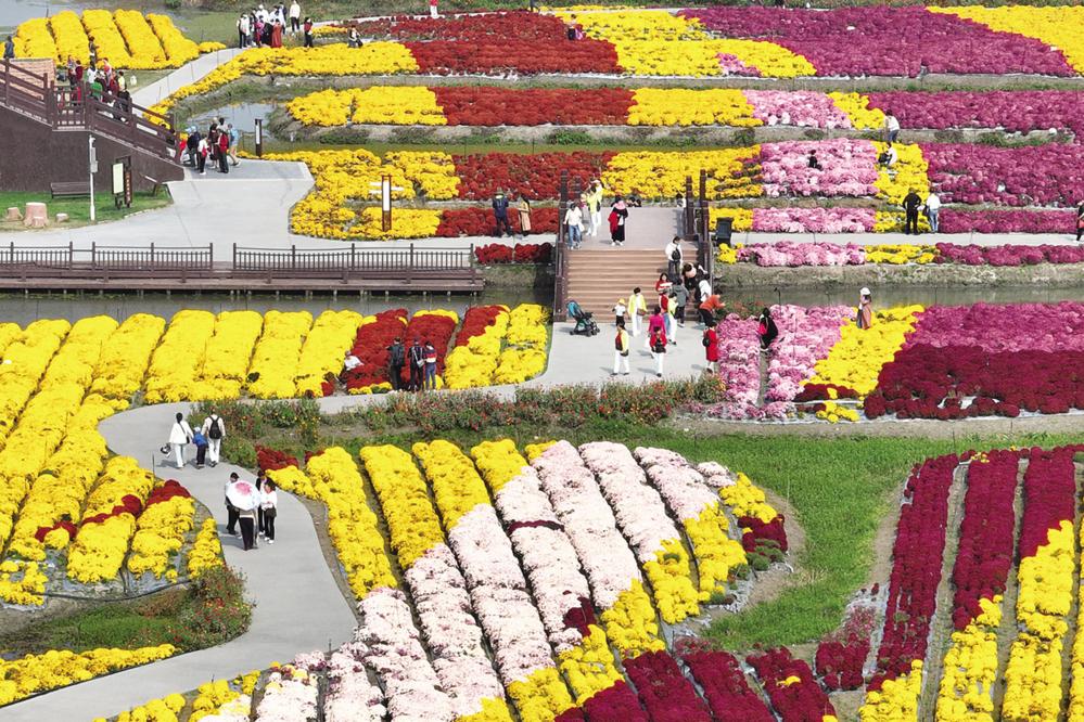 10月14日,游客在江苏省兴化市千垛景区赏菊游玩(无人机照片)。 金秋时节,各地色彩斑斓,秋景怡人。 新华社发(孟德龙 摄)