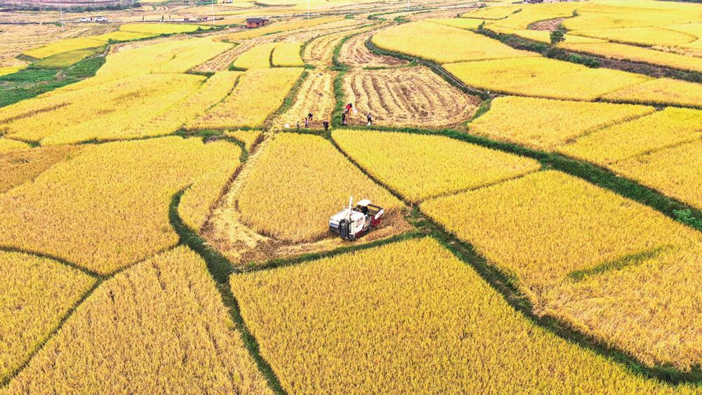 ▲10月13日,湖南省郴州市桂阳县欧阳海镇的农民驾驶农机在收割晚稻(无人机照片)。 金秋时节,各地农民抢抓农时收获农作物,田间地头洋溢着丰收的喜悦。 新华社发(唐雍钧 摄)