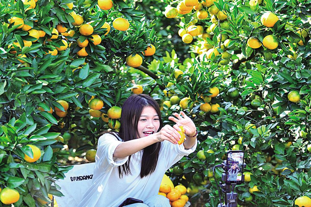 10月14日,农产品带货网络主播在湖北省宜昌市夷陵区一家生态橘园向网友推介“夷陵红”蜜橘。 金秋时节,各地农民抢抓农时收获农作物,田间地头洋溢着丰收的喜悦。新华社发(张国荣 摄)