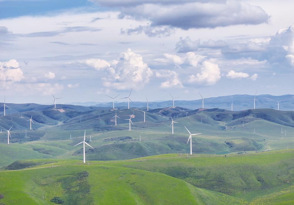 这是8月17日拍摄的内蒙古通辽市霍林郭勒一处风电场(无人机照片)。 内蒙古霍林郭勒市地处我国东北地区,曾以“煤电铝之城”闻名全国。进入新发展阶段,霍林郭勒市紧盯“双碳”目标,加快能源结构转型升级步伐,推动铝产业绿色化、集群化、高端化发展,带动城市由“煤电铝之城”向“绿电铝之城”进阶。 新华社记者 连振 摄