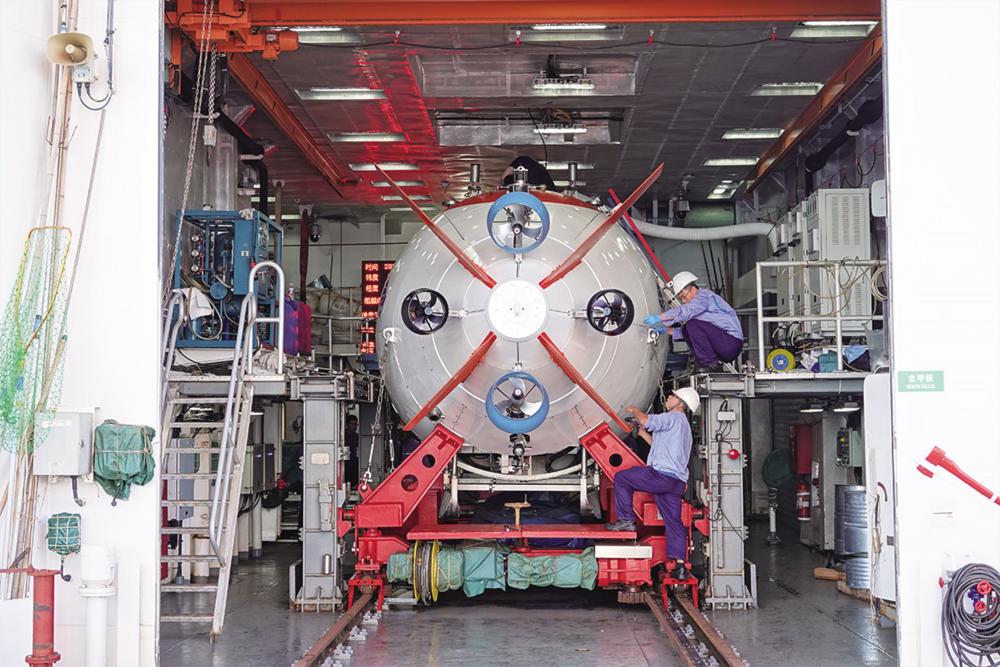8月18日,“蛟龙号”技术保障工程师蒋盛(左)、修可顺(右)进行下潜前的准备工作。 2024西太平洋国际航次科考队8月18日在西太平洋海域顺利完成“蛟龙号”航次首潜,这也是我国自主设计、自主集成的首台7000米级大深度载人潜水器“蛟龙号”的第300次下潜。历经海试、试验性应用、业务化运行等阶段,“蛟龙号”已在太平洋、印度洋、大西洋留下足迹。 新华社记者 王聿昊 摄