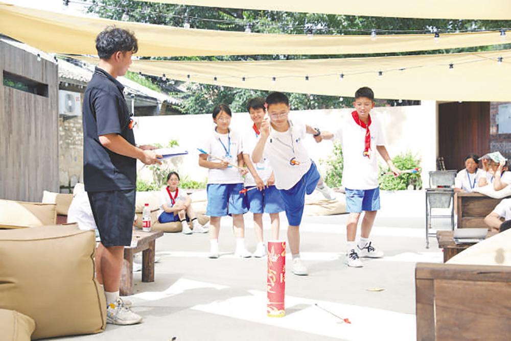 图④:来自甘肃省卓尼县的 15 名中学生来到北京,参加中建八局组织的卓尼励志夏令营活动。图为学生们在营地体验传统文化游戏投壶。 秦琳 摄