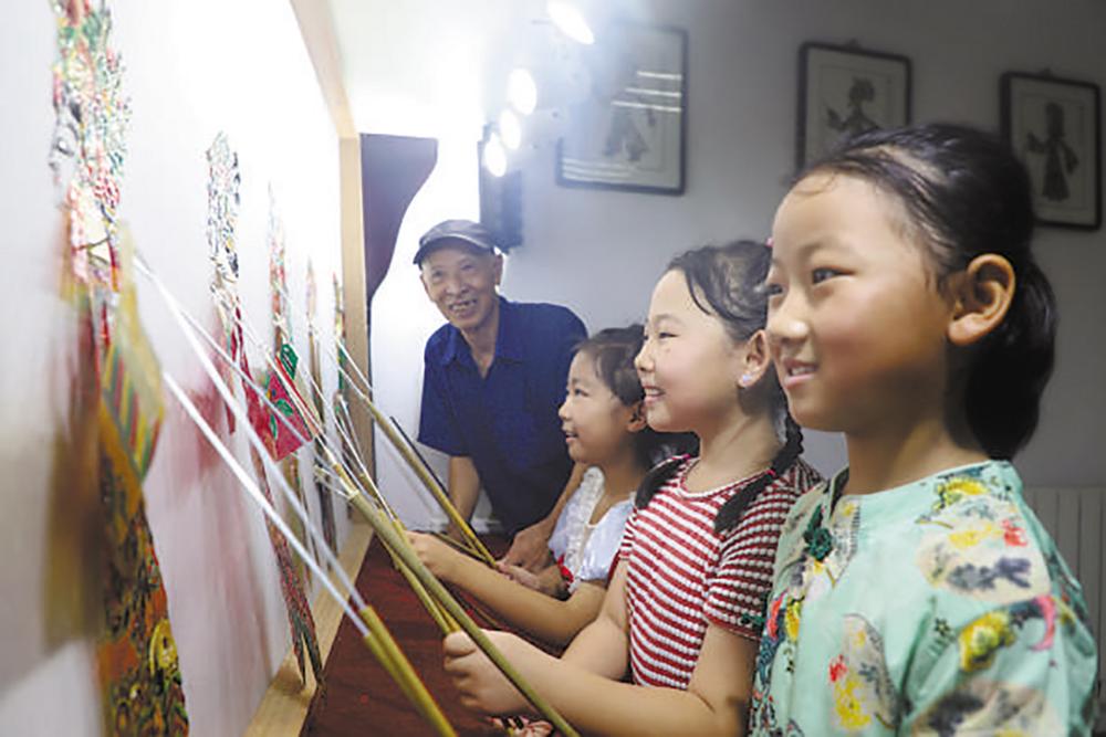 图⑥:河北省唐山市丰润区浭阳街道华府社区开设“非遗”小课堂,小朋友们在学习表演皮影戏。朱大勇 摄(人民视觉)