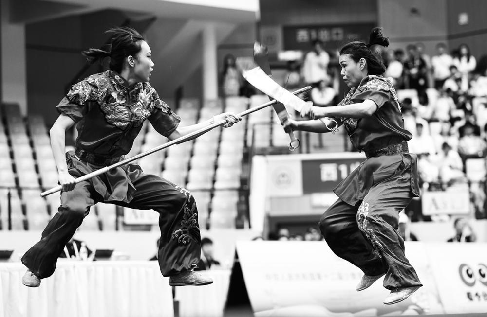 11月24日,广东队选手在比赛中。最终,广东队获得二等奖。 当日,第十二届全国少数民族传统体育运动会民族武术女子对练决赛在海南三亚举行。 新华社记者 张丽芸 摄