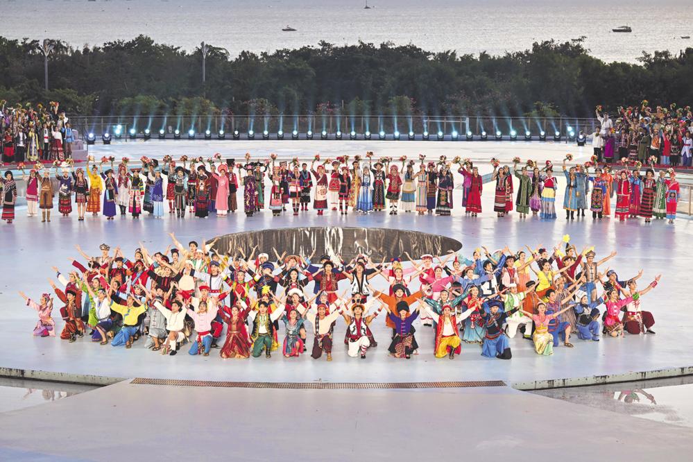 这是11月26日拍摄的联欢晚会现场。 当日,第十二届全国少数民族传统体育运动会民族大联欢活动在海南省三亚市举行。新华社记者 郭程 摄