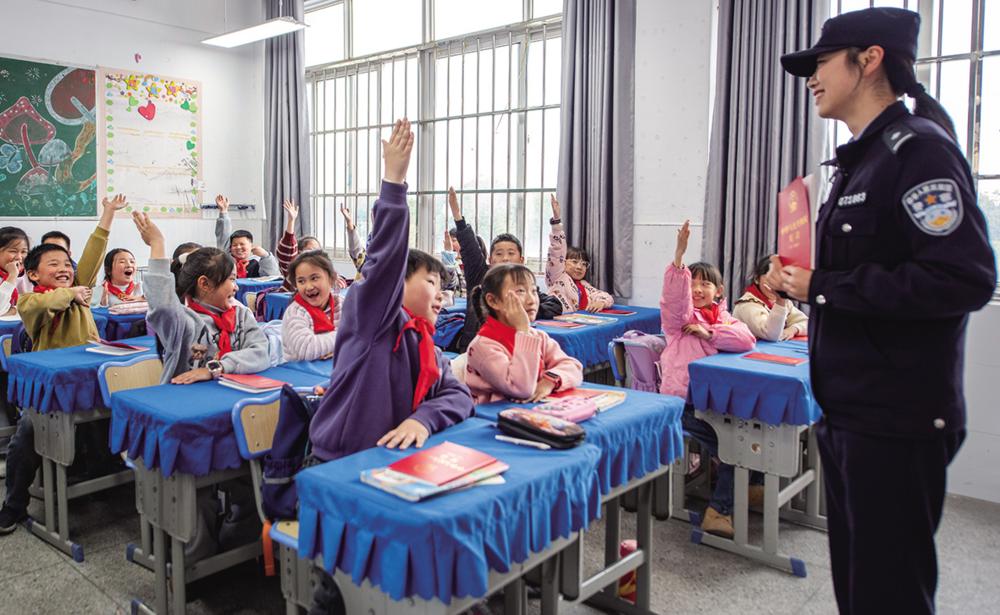 12月3日,在安徽省芜湖市繁昌区孙村镇中心小学,民警为小学生讲解宪法知识。 今年12月4日是第十一个国家宪法日,各地开展形式多样的活动普及宪法知识,宣传法治观念。 2024年“宪法宣传周”活动主题为“大力弘扬宪法精神,推动进一步全面深化改革”,时间为12月1日至7日。新华社发(肖本祥 摄)