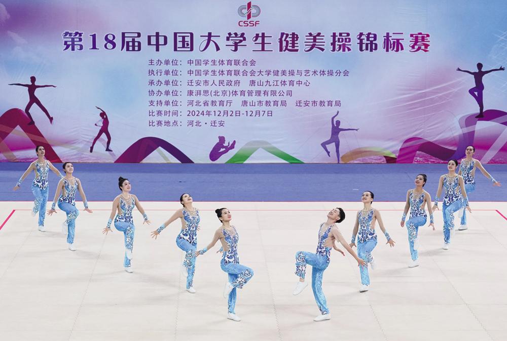 12月5日,江西师范大学代表队在甲组中国大学生中级校园健美操规定动作决赛中。最终,江西师范大学代表队获得该组别第一名。 当日,第18届中国大学生健美操锦标赛在河北省迁安市举行。 新华社记者 杨世尧 摄