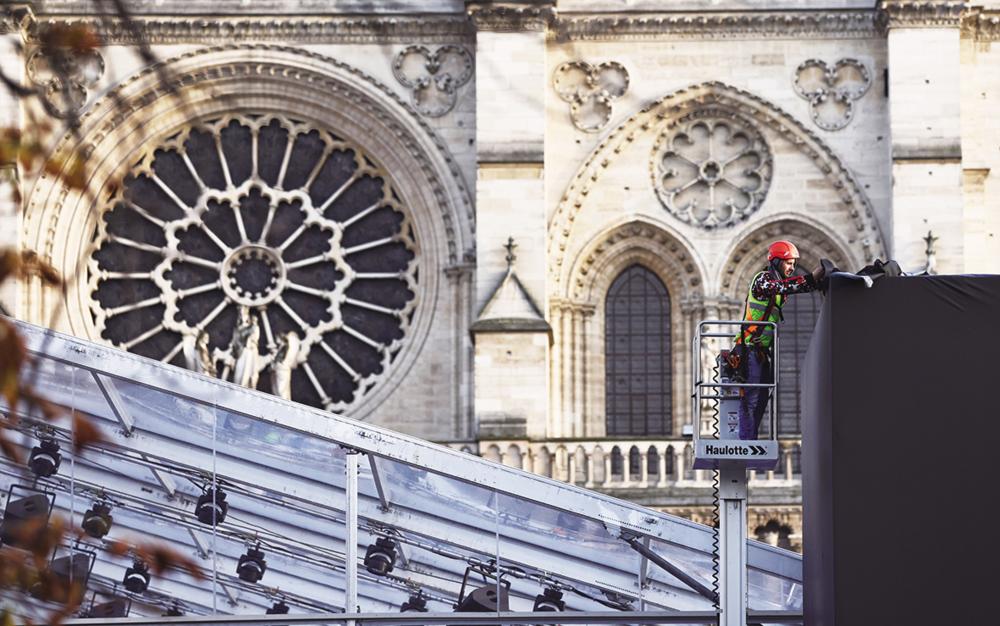 12月4日,在法国巴黎圣母院前,工作人员为重新开放仪式做准备。 历经5年多的修复,法国巴黎圣母院将于12月7日至8日举行重新开放仪式,8日起对公众开放。2019年4月15日,圣母院的屋顶和塔尖在大火中被烧毁。 新华社记者 高静 摄