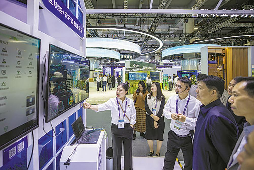 图⑤中国电信展台前,工作人员向客商介绍保障农产品质量安全的区块链技术。