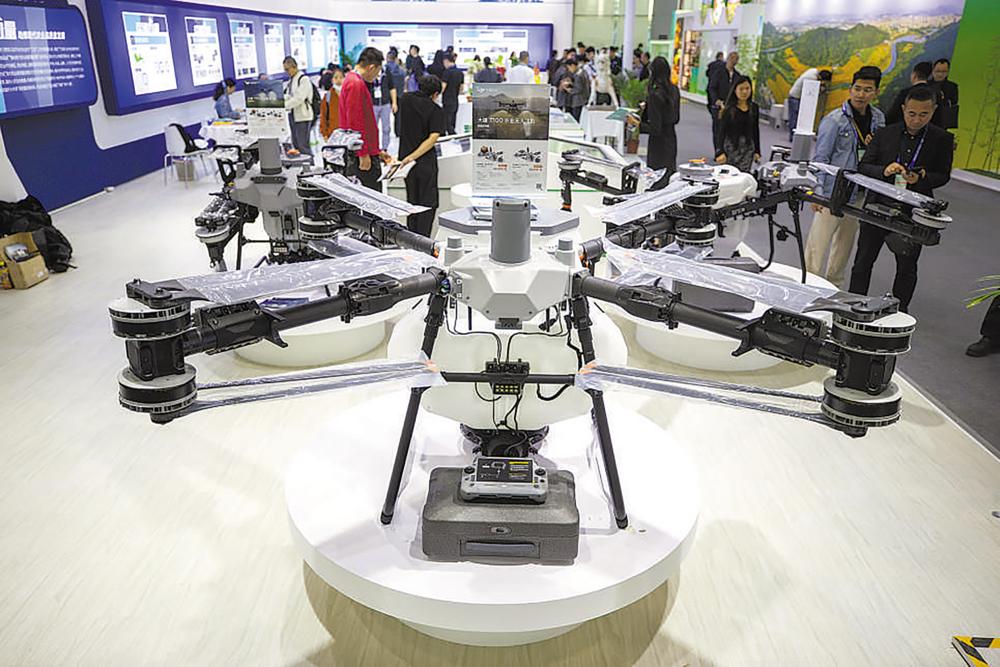 图⑧展会上展出的T100农业无人机,配备AI算法系统和激光雷达,支持喷洒、播撒、吊运等多种作业场景。