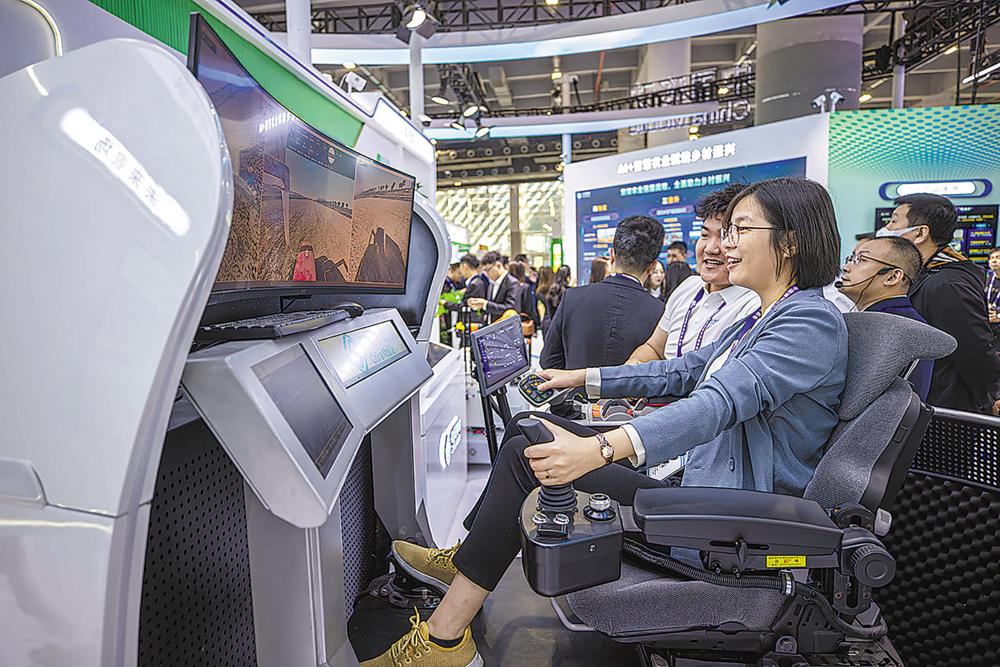 图⑦参观者体验通过5G技术远程操控拖拉机进行田间作业。