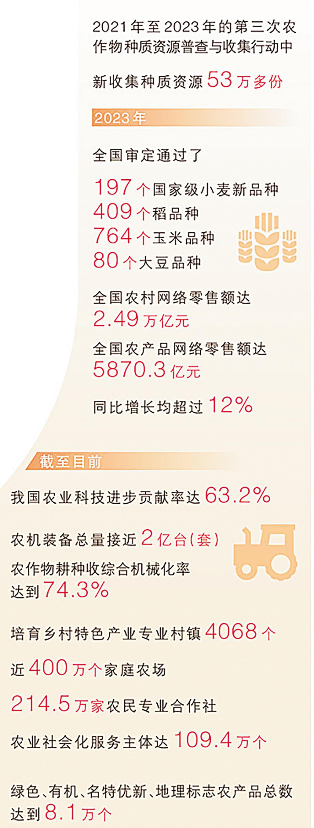 一面是技术装备加速上“新”。集喷洒、播撒、吊运等功能于一体的农业无人机,能够应对复杂的应用场景;搭配北斗导航系统的智能农机,可以进行耕、耙、播、收等多流程作业;通过AI技术识别虫害的智能测报设备,为田间管理提供数据支撑……一件件颇具创新性的技术装备,面向市场需求寻突破,立足科技创新要效益,标注着我国农业科技成果加速发展的新高度,更汇聚着农业增产、农民增收的澎湃能量。