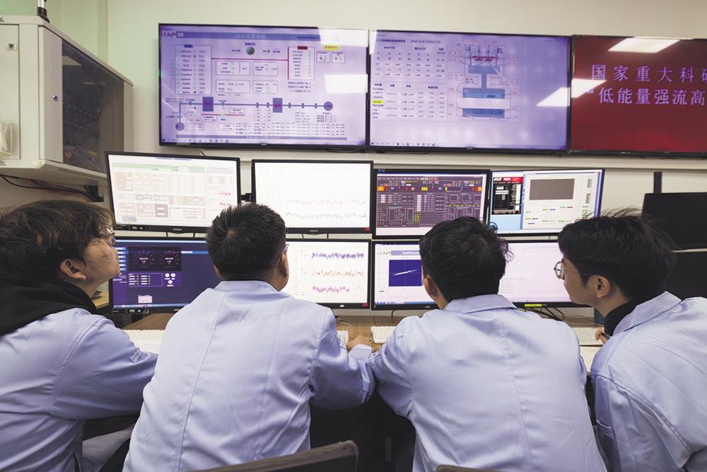 12月10日,科研人员在低能量强流高电荷态重离子研究装置控制室观察实验进展。 记者12月10日从中国科学院获悉,我国研制的国际首台低能量强流高电荷态重离子研究装置,日前通过国家自然科学基金委员会组织的专家验收。 据介绍,该装置可提供强度高、电荷态高的重离子束流,且离子种类多、能量变化范围宽,将为核天体物理、原子物理等前沿研究及核能材料研发等应用研究提供先进实验条件。 该装置为国家重大科研仪器研制项目,由中国科学院近代物理研究所研制。 新华社记者 金立旺 摄