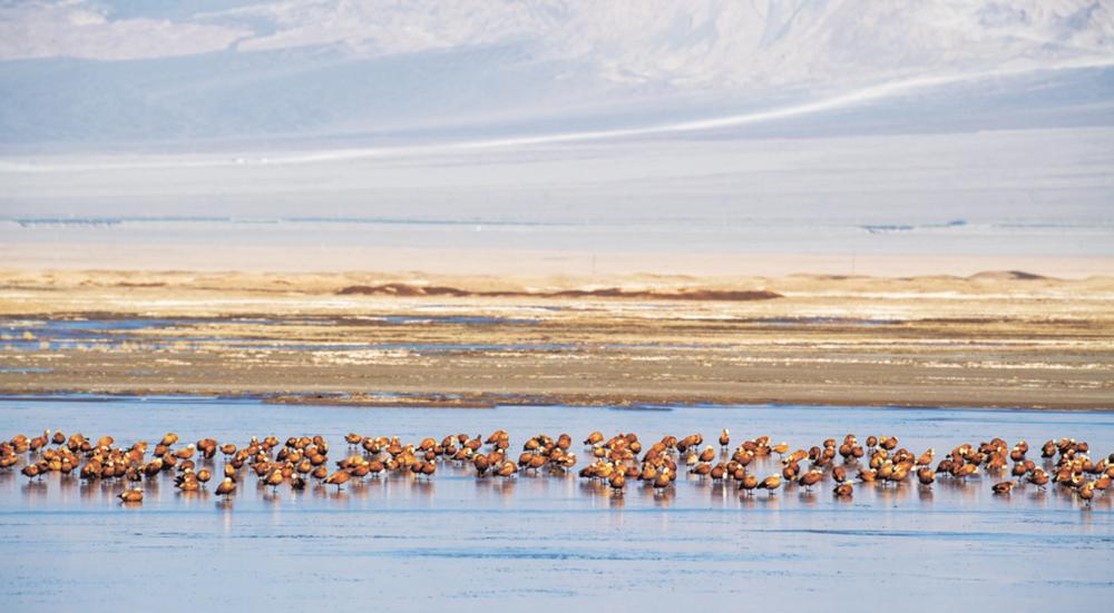 每年的秋末冬初,昆仑山脚下的尕斯库勒湖湿地便会迎来数千只赤麻鸭,它们在结了薄冰的湖面上或嬉戏,或休息,颇为惬意。