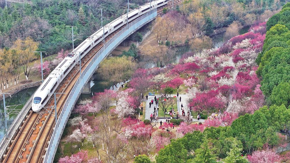 2月22日,安徽省合肥市蜀山区匡河公园梅花绽放,列车从一旁驶过(无人机照片)。 正月是农历新年的第一个月,春节前后会迎来标志着春天开始的立春节气。正如南宋诗人杨万里的诗句:“春回十日梅初觉,一夜商量一并开。”乍暖还寒中,悄然绽放的梅花给人们带来新年里第一缕春的气息。新华社发(陈三虎 摄)