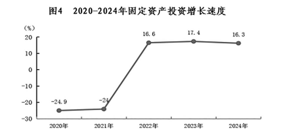 全年固定资产投资^[5]同比增长16.3%。按产业分,第一产业投资下降1.2%,第二产业投资增长22.3%,第三产业投资下降15.4%;按行业分,制造业投资增长31%,电力、热力、燃气及水生产和供应业投资增长32.3%,住宿和餐饮业投资增长4.9%,租赁和商务服务业投资增长43.1%;按经济类型分,国有投资增长23.9%,民间投资^[6]下降5.8%;按主要投资领域分,一般性工业投资增长11.4%,新能源项目投资增长20.9%,基础设施投资^[7]下降8.4%,房地产开发投资下降38.9%。