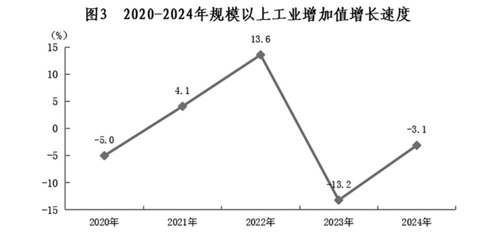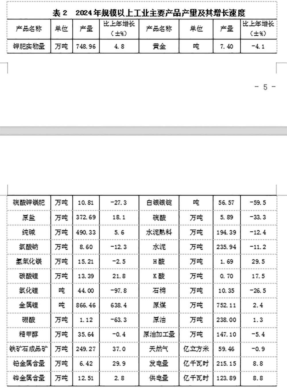全年规模以上工业^[4]增加值同比下降3.1%。按经济类型分,国有企业增加值增长16.6%,股份制企业增加值下降3.4%,外商及港澳台商投资企业增加值增长18.8%;按门类分,采矿业增加值增长13%,制造业增加值下降9.3%,电力、热力、燃气及水生产和供应业增加值增长12.1%;按产业分,新材料产业增加值增长109.2%,特色生物产业增加值增长15.9%,新能源产业增加值增长15.5%,煤化工产业增加值增长6.4%,油气化工产业增加值增长4.2%,金属冶金产业增加值下降1.6%,盐湖化工产业增加值下降8.5%。