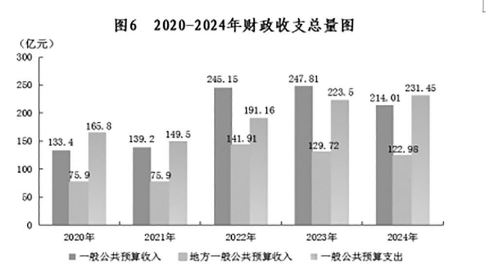 全年一般公共预算收入214.01亿元,同比下降13.6%。其中,地方一般公共预算收入122.98亿元,下降5.2%。地方一般公共预算收入中税收收入102.96亿元,下降11.1%。其中,增值税32.1亿元,下降23.1%;企业所得税13.26亿元,下降37.1%;个人所得税2.03亿元,下降23.9%;资源税37.85亿元,增长10.4%;城市建设维护税5.04亿元,下降19.8%。全年一般公共预算支出231.45亿元,同比增长3.6%。其中,教育支出17.08亿元,增长1.6%;科学技术支出0.56亿元,下降18.1%;文化旅游体育与传媒支出4.17亿元,下降24%;社会保障和就业支出32.12亿元,增长4.7%;卫生健康支出12.06亿元,下降12.7%;城乡社区支出59.04亿元,增长13.7%;交通运输支出4.54亿元,下降27.5%。
