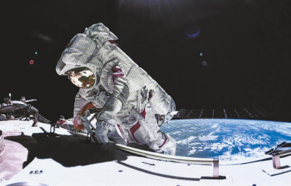 图②:神舟十七号航天员汤洪波在空间站组合体舱外作业画面。