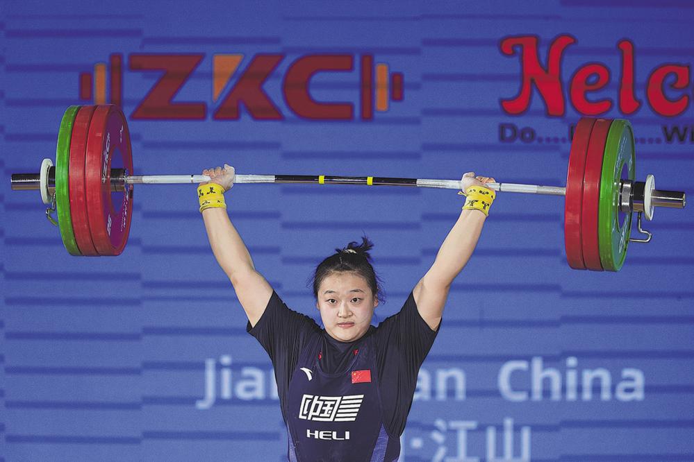 5月14日,中国选手田东苹在挺举比赛中。最终,她获得抓举、挺举、总成绩三项冠军。 当日,2025年亚洲举重锦标赛女子87公斤级比赛在浙江江山举行。 新华社记者 侯昭康 摄