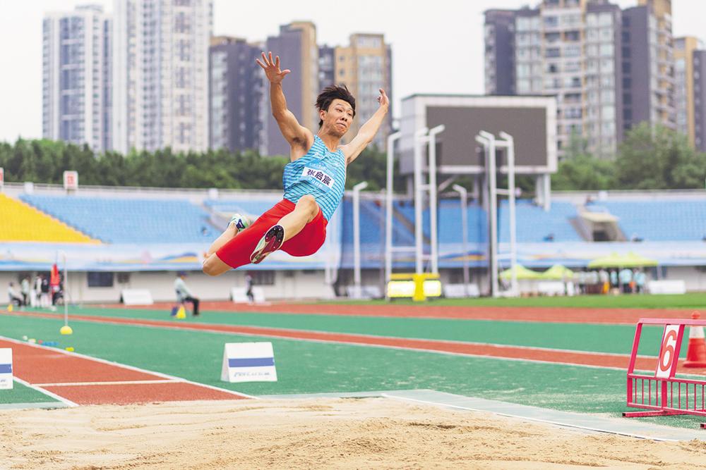 5月14日,天津队选手张启宸在决赛中。最终,他以7米98的成绩获得亚军。 当日,第三届“一带一路”田径邀请赛暨2025年全国田径大奖赛第三站男子跳远决赛在重庆举行。新华社记者 黄伟 摄