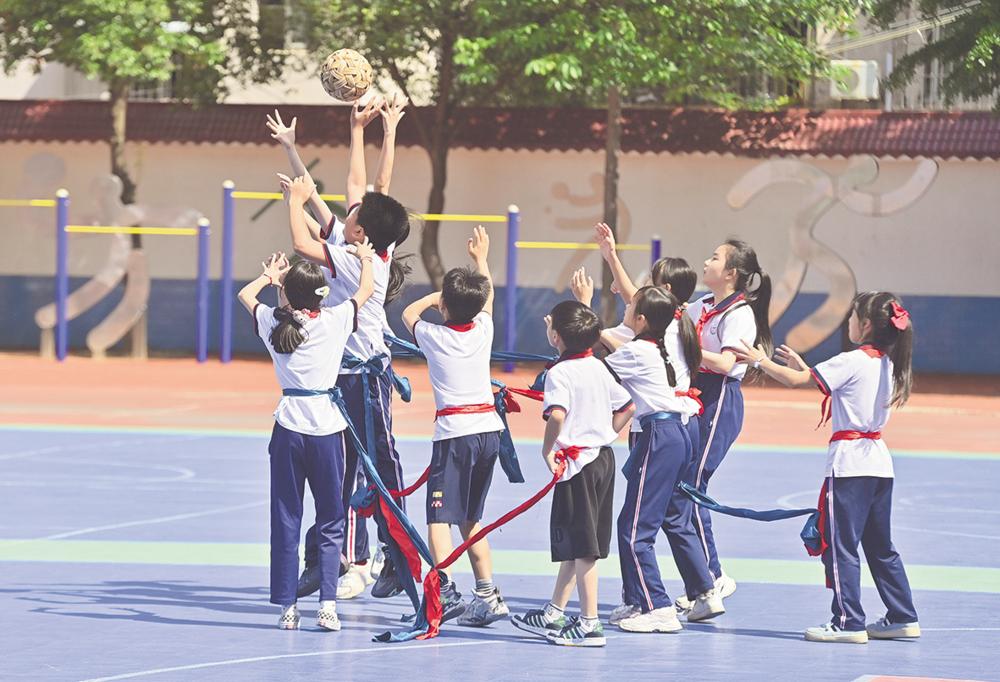 5月13日,学生在大课间打竹球。 初夏时节,广西梧州新兴小学开展丰富多彩的阳光体育大课间活动,让学生在竹球、踩高跷、射箭、陀螺、滚铁环等传统体育项目中,享受运动的快乐。 新华社记者 黄孝邦 摄