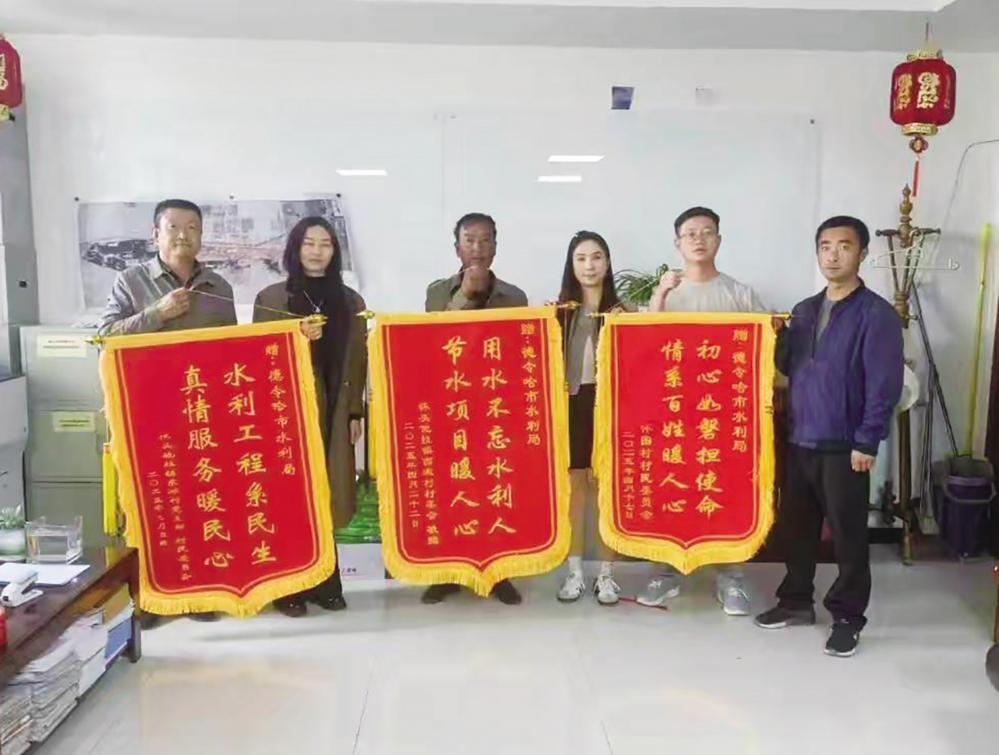 如今,庄稼喝饱了水,村民们的脸上也绽放出比以往更加灿烂的笑容。5月8日清晨,一辆满载着感恩与喜悦的车辆缓缓驶向德令哈市水利局。东滩村、西滩村、怀图村的书记和村民代表带着精心制作的锦旗来了。当“水利工程系民生,真情服务暖民心”的锦旗在金色阳光下徐徐展开时,锦旗上的鎏金大字熠熠生辉,诉说着水利工程惠民生,汩汩清泉润心田的生动实践。