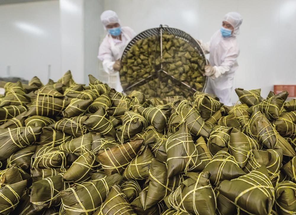5月21日,湖北省宜昌市秭归县屈姑国际农业集团工人在粽子生产车间忙碌。 端午节临近,粽子厂家和老字号酒店纷纷赶制粽子,满足市场需求。 新华社发(郑家裕摄)