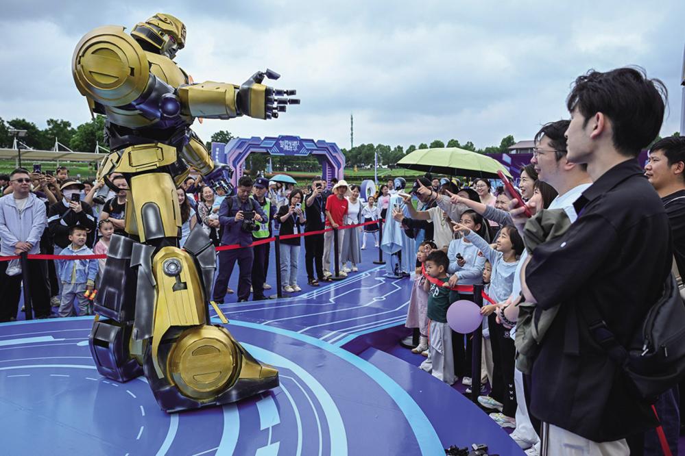 6月2日,在武汉市蔡甸区花博汇景区,游客与机器人互动。 当日,“世界机器人嘉年华”活动在武汉花博汇景区举行。本次活动以近百台机器人为表演核心,机器人乐队、机器宠物、化妆机器人等陆续亮相,游客可以近距离与机器人接触,感受科技赋能文化与生活的魅力。 新华社记者 杜子璇 摄