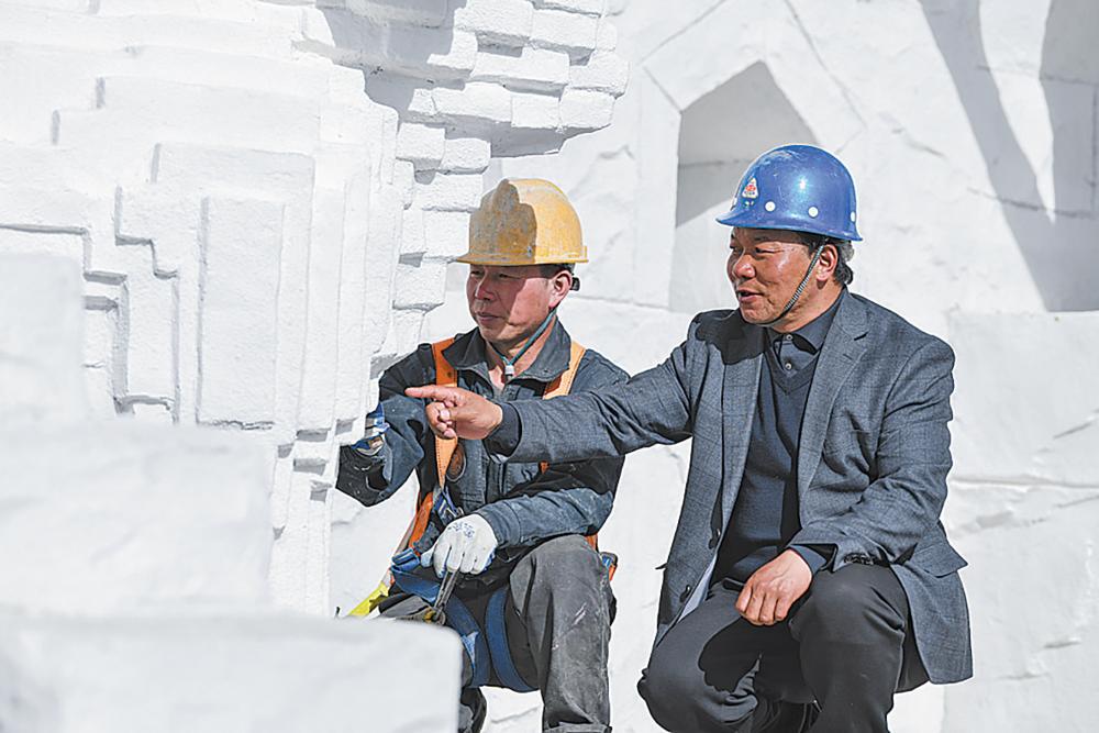 景区内盐雕师傅正在进行技术交流。青海日报记者 张鹏 摄