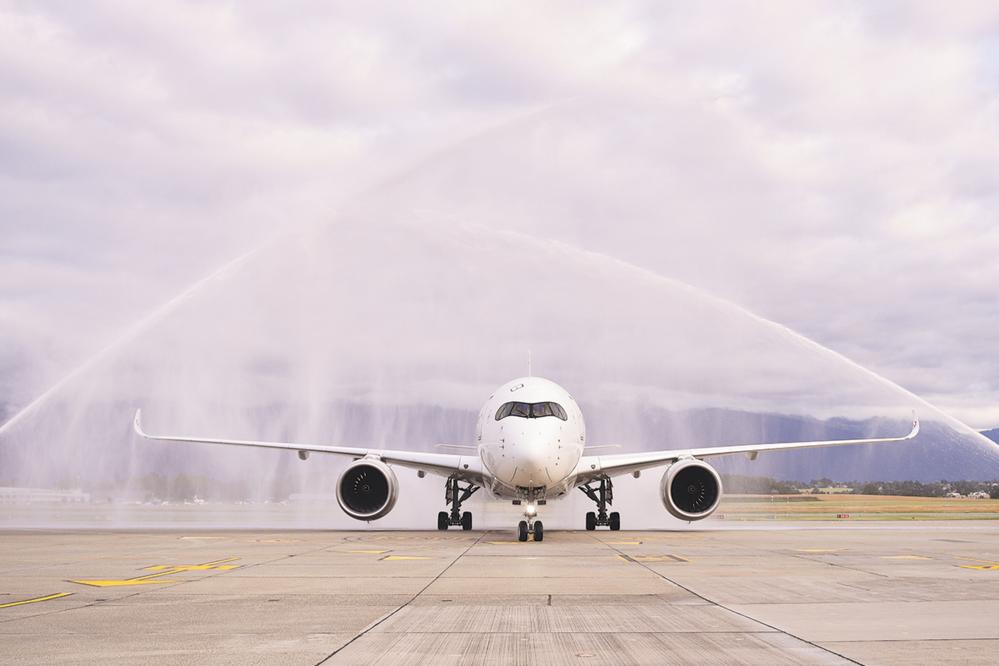 6月16日,在瑞士日内瓦,从上海浦东国际机场起飞的MU217航班穿过象征民航最高礼仪的“水门”。 中国东方航空公司上海至日内瓦直飞航线16日正式开通。当地时间早上7时25分,从上海浦东国际机场起飞的MU217航班平稳降落在瑞士日内瓦国际机场,缓缓穿过象征民航最高礼仪的“水门”,圆满完成从“东方明珠”上海到“和平之都”日内瓦的首航。 新华社记者 连漪 摄
