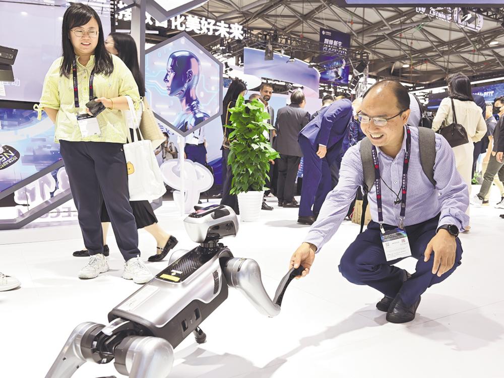 6月18日,观众在中国电信展台与智能机器狗互动。 当日,2025年世界移动通信大会(上海)开幕。展会为期三天,全球创新者、政策制定者及商业领袖共同探讨5G融合、人工智能+、行业互联等技术和产业发展趋势。新华社记者 陈爱平 摄